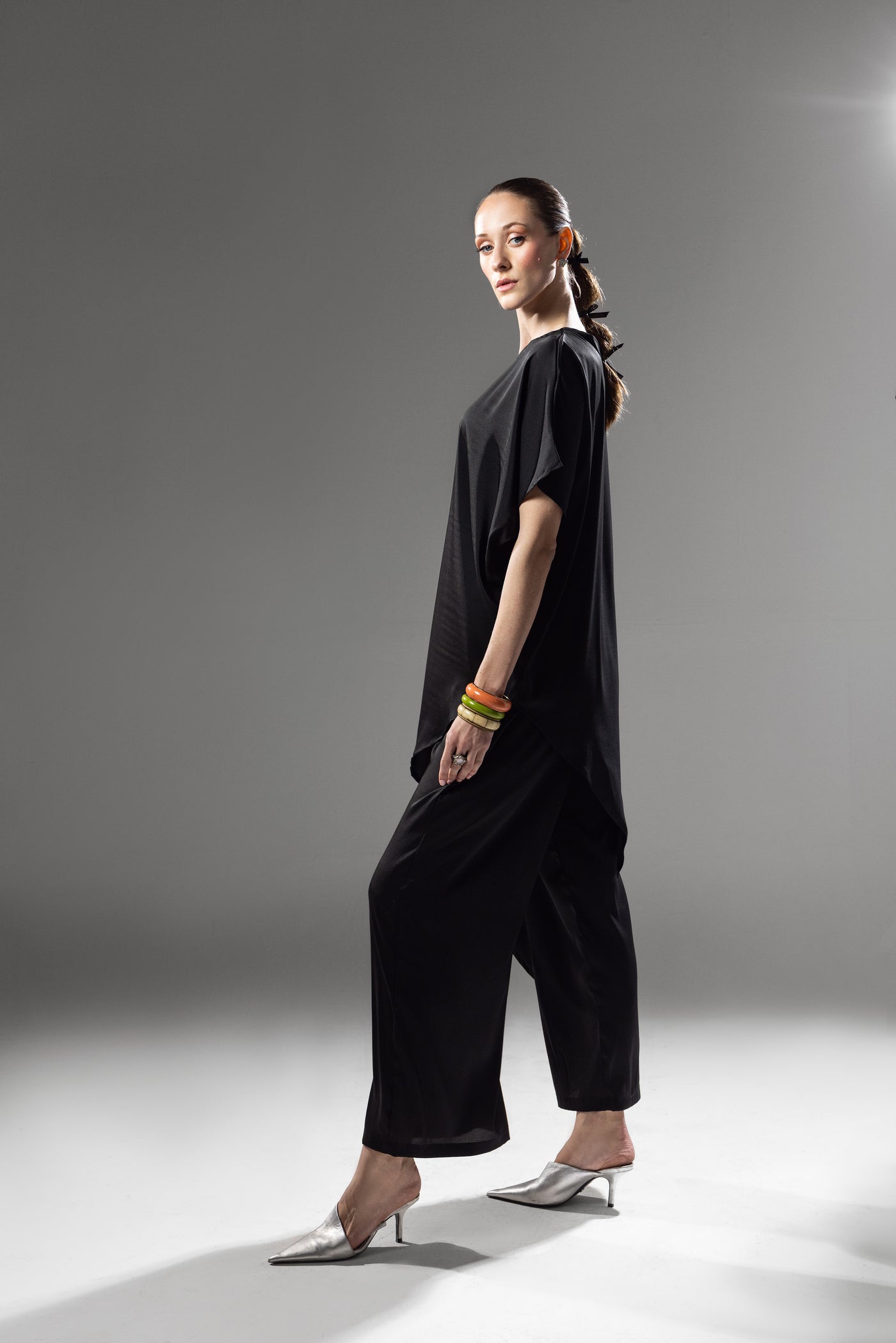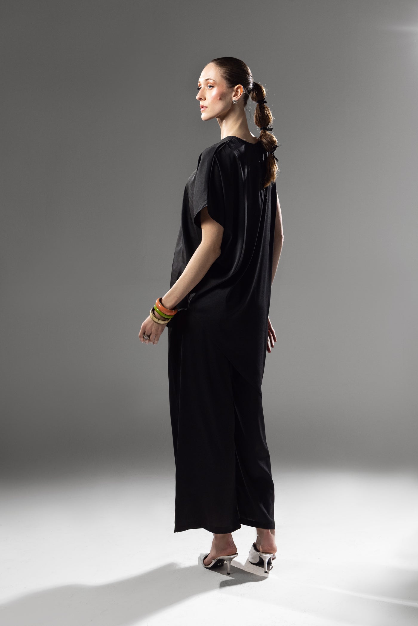 The relaxed short sleeves and clean neckline balance structure with ease, while the deep black tone enhances the fabric’s subtle luminosity. Effortless yet elevated, this piece transitions seamlessly from evening events to understated formal settings.